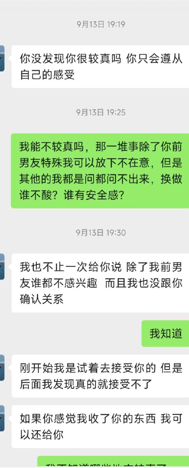 我问过她以前的事,还有其他的,都不跟我讲,我也没法了解,但是我知道她上段感情谈了很久,心中还没放下,跟女性朋友还是去跟男的吃饭,我也问不出来,心里就挺憋屈,于是就造成了我频繁的给她发信息